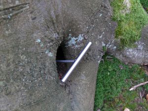 Die Baumbegutachtung erfolgt im Regelfall in mehreren Prüfstufen: zunächst werden die ausgewählten Verkehrsbäume, Tragbäume oder Aktivbäume einer visuellen Begutachtung vom Boden aus unterzogen (Prüfstufe 1). Werden hierbei Schadensmerkmale festgestellt (auf dem Foto links ist eine Längsspaltung des Schaftes zu sehen), welche die Stand- oder Bruchsicherheit oder die Tragfähigkeit maßgeblich beeinflussen, erfolgt eine eingehende, weiterführende Untersuchung.